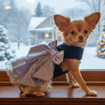 If you're looking for sophistication, this dress is the one for your pup! This beautiful dress features a black velvet bodice with a gray skirt overlaid with shimmery snowflakes. An oversized gray bow at the waist completes the look.