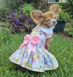 Your pup can enjoy a dreamy afternoon in our Pastel Meadow dress. Watercolor flowers decorate this sweet dress along with a pretty pink double bow and a pink edged collar.