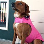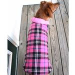 Reversible Fleece Lined Puffer Dog Coat in pink and black plaid is easy on and easy off. This stylish and warm blanket coat features a solid color puffer material on one side and a soft fleece lining on the other. Available with an adjustable hook and loop closure fit at the neck and belly, and leash access. Available in sizes XS to 3XL.