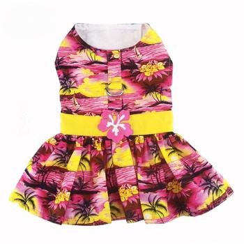 Bright breezy, and beach-ready! This Hawaiian vibrant Tropical Sunset Dog Dress features a yellow waistband with a hibiscus flower applique and is a must-have summer outfit for small dogs. Bring on the island vibes!